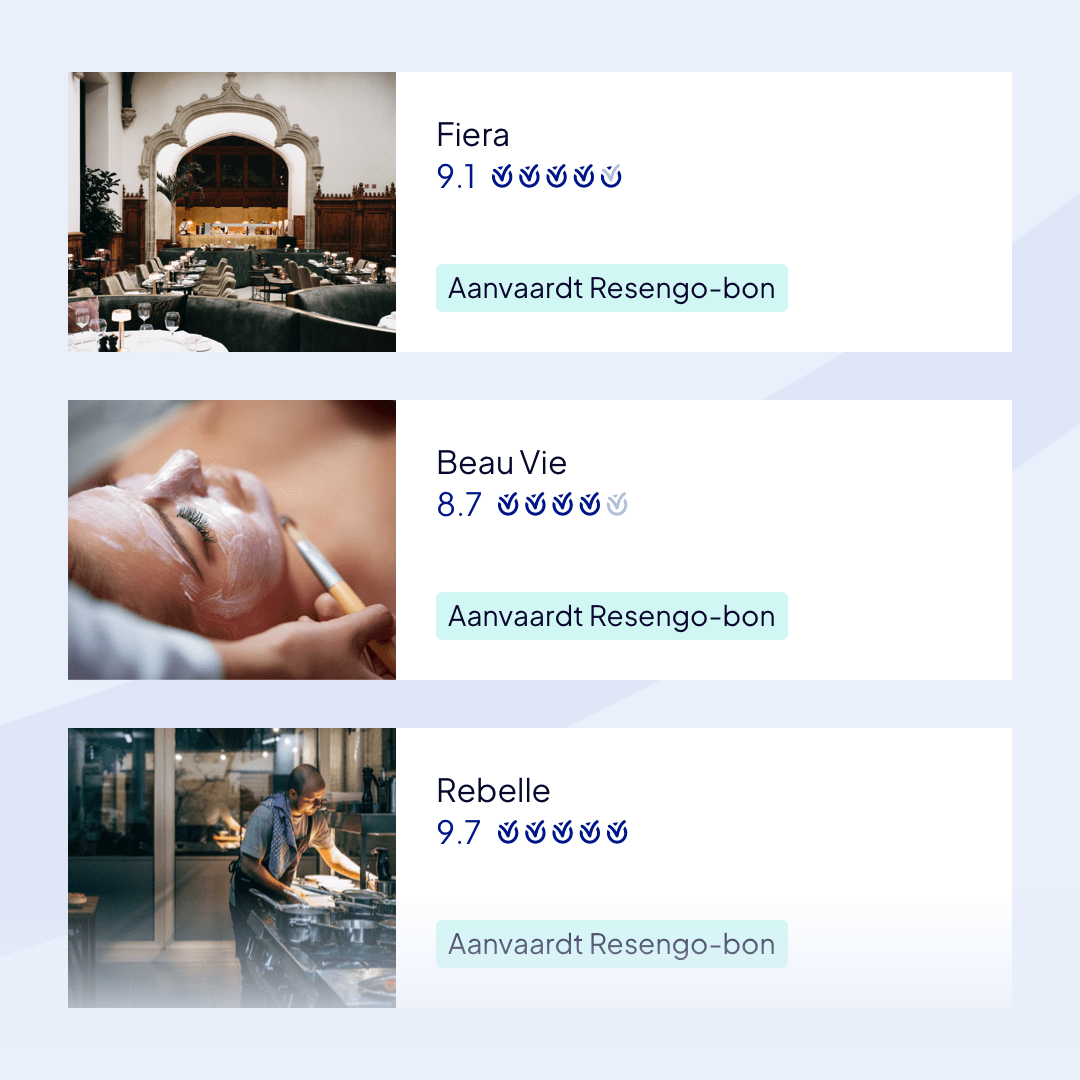 Accepteer, net als duizenden andere ondernemers, de Resengo bon in jouw zaak en maak je zaak zichtbaar voor miljoenen gasten. Dagelijks kiezen duizenden mensen een restaurant of wellness zaak waar ze terecht kunnen met hun Resengo bon. Door deze bon te integreren in jouw onderneming zet je jouw zaak in de kijker voor hen.